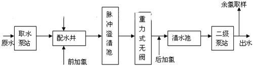 圖2 加氯工作流程圖 如圖2示:前加氯系統(tǒng)與后加氯系統(tǒng)共用一個氯氣氣源,共設(shè)兩組供氯氯瓶,兩組氯瓶互為備用.,根據(jù)氣瓶壓力自動切換。如當(dāng)正在使用的一組氯瓶出口管上的壓力小于某個值時,壓力式自動切換器將自動切換到另一組氯瓶,保證連續(xù)供氯。在加氯自動控制系統(tǒng)中,將PLC的模擬量輸出信號送給加氯機的模擬量輸入端,通過控制加氯機中執(zhí)行器的動作,控制水射器中的真空度,進而控制了加氯量的大小。加氯自動控制系統(tǒng)中還包括氯氣氣源的自動切換,漏氣自動報警和漏氯吸收裝置的自動控制。在加氯自動控制系統(tǒng)中,關(guān)鍵是對加氯機的控制。 自動控制氯系統(tǒng)可進一步配備計算機數(shù)據(jù)采集系統(tǒng),以便實現(xiàn)加氯間無人值班目標(biāo)。把出廠水中的余氯分析儀測定的數(shù)據(jù)送到加氯間,中心化驗室和調(diào)度室,以便值班人員可隨時監(jiān)測出廠水余氯值和調(diào)整余氯設(shè)定值。 3影響加氯自動控制的主要原因(1)采樣時間 采樣時間的長短,直接影響加氯的效果。為了達到自動控制的目的,要求氯氣經(jīng)充分混合后馬上檢查余氯值作為復(fù)合環(huán)控制的反饋信號。但現(xiàn)場中,有的工藝設(shè)計將混合接觸時間定的太長,對控制系統(tǒng)來說,即意味著純滯后時間的延長,造成測定結(jié)果不準(zhǔn)確。因此,在后加氯的投加點和采樣點的選擇上,工藝設(shè)計時應(yīng)充分考慮自動控制的要求。通常情況下,后加氯在清水池進水管上,在氯氣與水充分混合后應(yīng)在盡可能短的時間內(nèi)取樣,水經(jīng)過加氯點到余氯分析儀處的水流時間一般不要超過5分鐘,在水與氯氣充分混合的前提下取樣時間越短越好?捎萌缦露N方法論縮短取樣時間:一是縮短取樣管的長度;二是加快取樣管中的水流速度如加大取樣水管排水分流管。(2)檢測設(shè)備 余氯分析儀的檢測值的正確性也是控制加氯的關(guān)鍵。由于余氯分析儀存在零點漂移,應(yīng)定期進行校正。同時在軟件編制時,對信號數(shù)據(jù)的處理也可考慮濾波、穩(wěn)定等形式進行適當(dāng)處理以增加數(shù)據(jù)的可靠性。(3)信號傳輸 主要是各底層設(shè)備的檢測信號要及時準(zhǔn)確的傳輸?shù)絇LC中,然后進行處理。現(xiàn)場中大都設(shè)備采用標(biāo)準(zhǔn)電流信號(0―20mA或4―20mA)。4 自動加氯系統(tǒng)的應(yīng)用 南方某一水廠,以江水為水源,水廠原設(shè)計規(guī)模為6萬m3/d。工藝流程如下示: